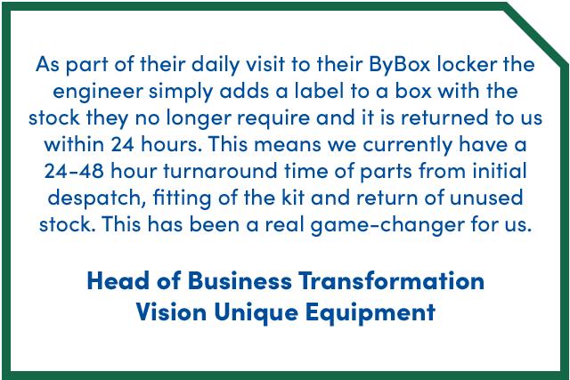 Vision Unique Equipment (VUE) are industry leaders in fleet risk management solutions. Their vehicle hardware has been developed over the 20 years they have been working in the field, and their easy-to-use software systems give organisations quick insights that inform preventative maintenance decisions, minimising the time that vehicles are off the road. Thinventory helped VUE gain control of the stock that was frequently going missing on customer sites and contributing towards unnecessary costs. By using our UK wide network of secure locations, VUE also gained end to end visibility of their parts in the field.